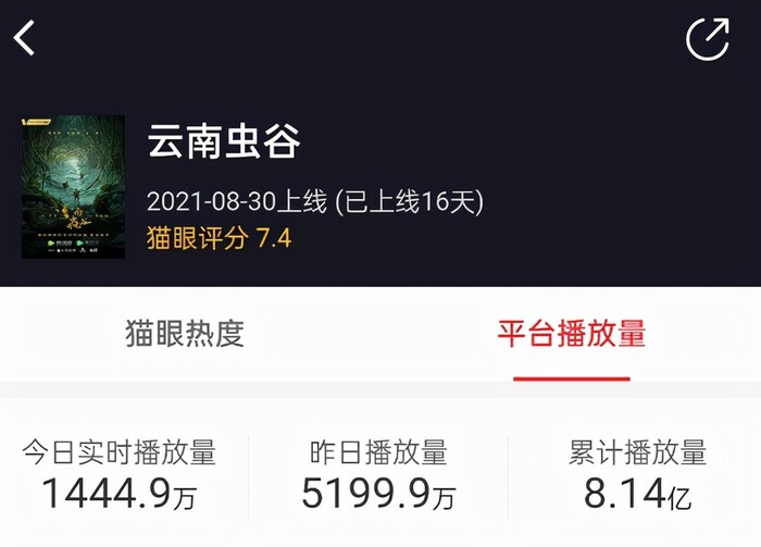 Dẫn đầu là Ma thổi đèn chi Vân Nam Trùng Cốc với tổng lượt xem la 22,33 triệu. Được biết, trước đó theo thống kê của trang Maoyan và Douban, tác phẩm đạt được 800 triệu lượt xem và thu về 6.7 điểm đánh giá, trong đó 3 sao chiếm số lượng nhiều nhất với tổng số 41.1%.