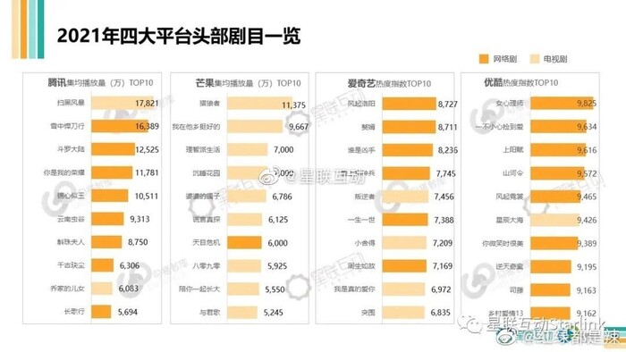 Trong năm 2021, có 5 bộ phim phá 100 triệu/ tập là Tảo hắc phong bạo với 5,33 tỷ, trung bình 190 triệu/tập, Tuyết trung hãn đao hành 163 triệu/tập, Đấu la đại lục do Tiêu Chiến và Ngô Tuyên Nghi thủ vai chính đạt 125 triệu 1 tập, Em là niềm kiêu hãnh của anh vừa đủ 117 triệu/tập và đứng vị trí thứ 5 là Cẩm tâm tựa ngọc với 105 triệu/tập.