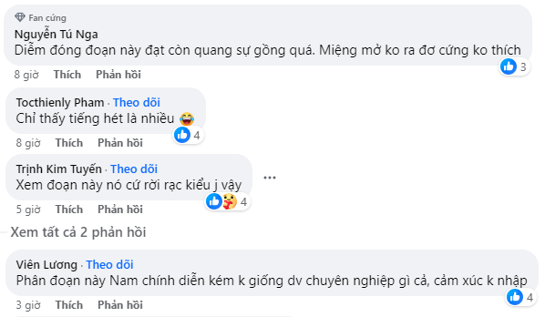 - Diễm đóng đoạn này hay còn Quang Sự gồng quá, miệng mở không ra, đơ cứng!