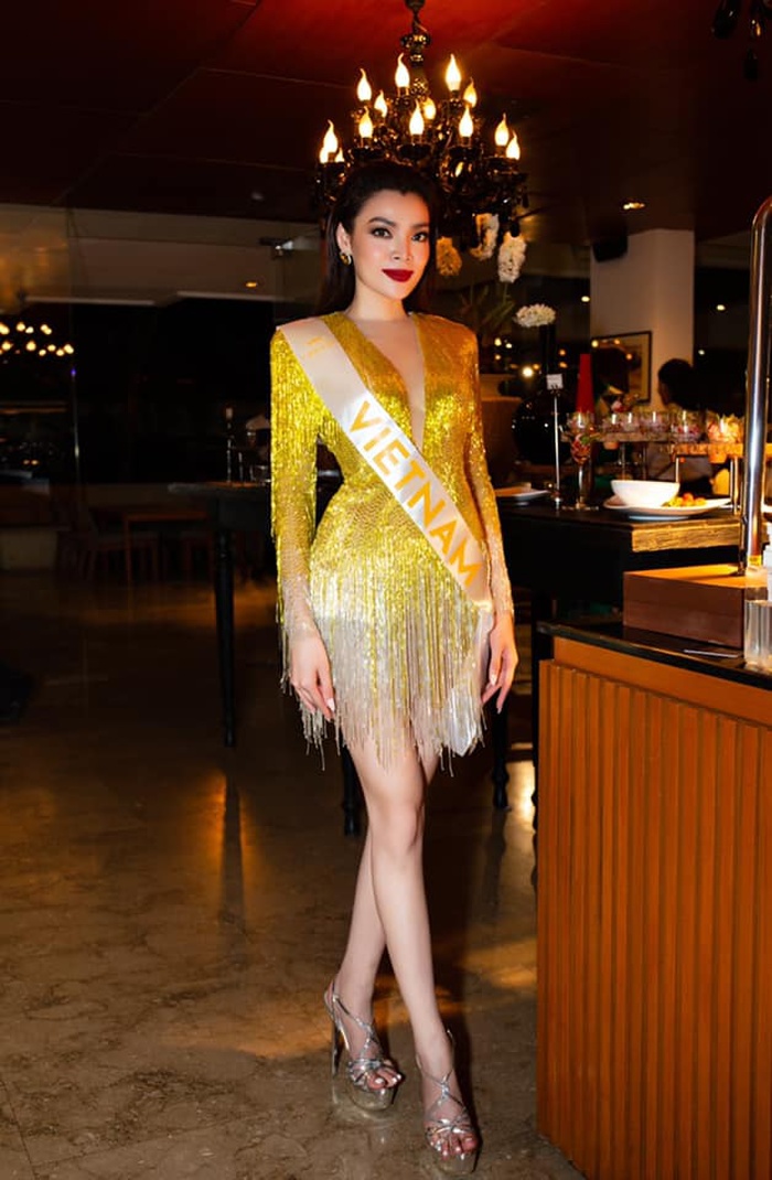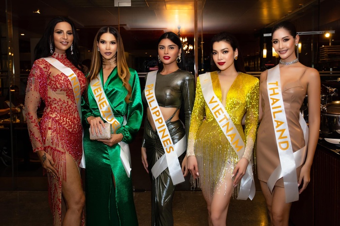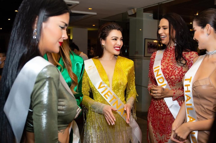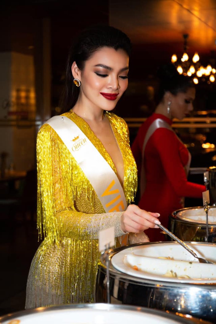 Cô vẫn trung thành với layout tóc xoăn bồng bềnh, son môi đỏ đậm để toát lên vẻ đẹp nữ hoàng của mình. Đọ sắc cùng dàn đối thủ, Trân Đài không thua kém so với các đại diện đến từ Thái Lan, Philippines, Venezuela, India.