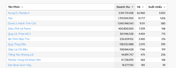 Theo số liệu từ Box Office Vietnam, sau gần 1 tháng công chiếu, Mai của Trấn Thành cuối cùng đã mất ngôi đầu phòng vé vào tay Kung Fu Panda 4. Cụ thể, sáng 8/3, bom tấn hoạt hình do DreamWorks Animation sản xuất đã kiếm được 6 tỷ đồng trong ngày đầu khởi chiếu tại Việt Nam. Thành tích này bỏ xa doanh thu 1,4 tỷ đồng tính tới thời điểm cùng ngày của Mai.