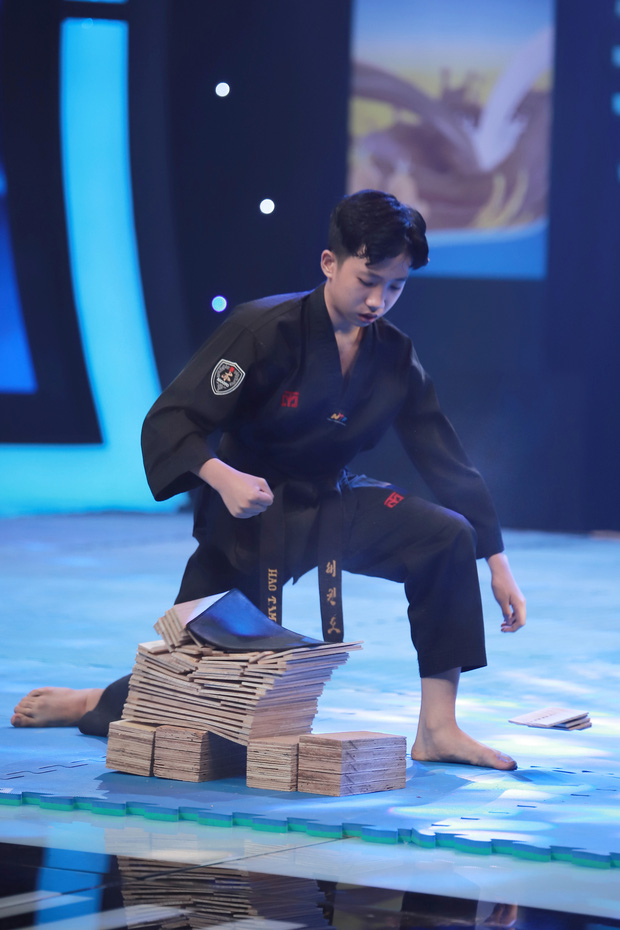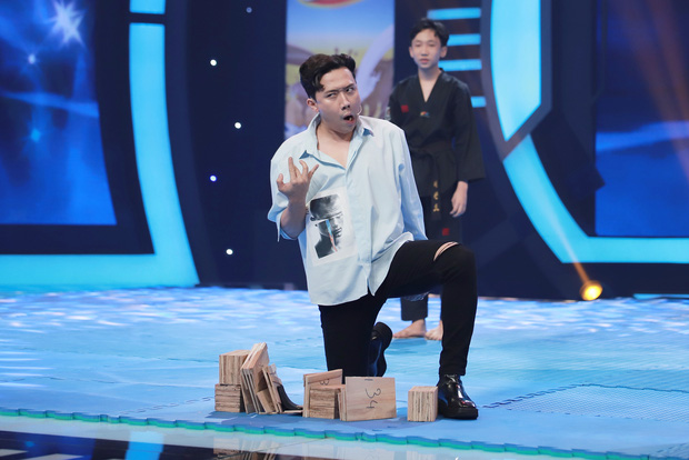 Dường như để khẳng định câu nói "6 múi sao bằng vựa muối" mà nam giám khảo dùng để "đá đểu" khách mời, Trấn Thành đã xung phong lên thực hiện thử thách chặt đôi 5 tấm ván. Nếu như các siêu nhí sử dụng kungfu vận khí, thì Trấn Thành chỉ biết dùng hết sức lực đẩy lực thẳng xuống mục tiêu. Kết quả không ngoài dự đoán, tay của nam MC va thẳng vào tấm ván, để lại cú đau điếng không nói nên lời.