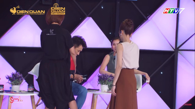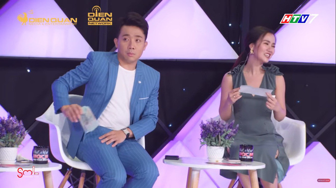 Trấn Thành thốt lên: "Trời ơi, con quỷ". Võ Hạ Trâm ngượng ngùng nói: "Nói lộn thôi, làm gì ghê dữ vậy".