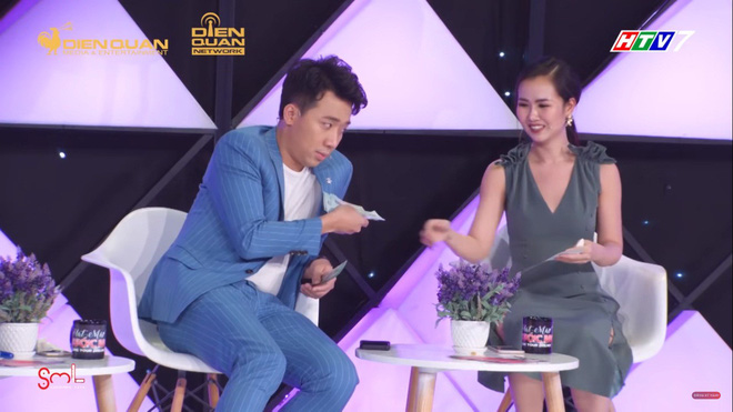 Võ Hạ Trâm giải thích: "Ý là mình mượn anh Thành, anh ấy sẽ cho mình mượn trực tiếp rồi về mình chuyển khoản cho anh ấy. Trấn Thành là ngân hàng cho vay nặng lãi". Nói rồi cô quay sang nhắc Trấn Thành: "Có 5 triệu, sao anh đếm lâu thế".