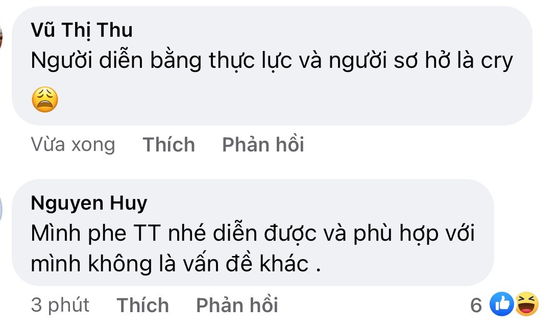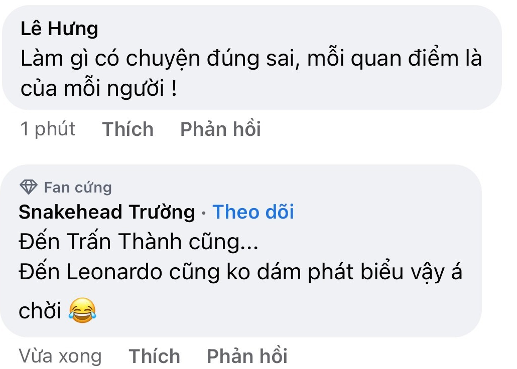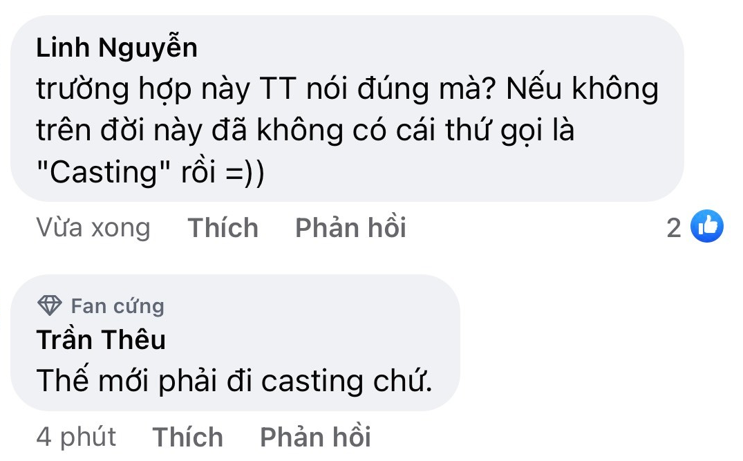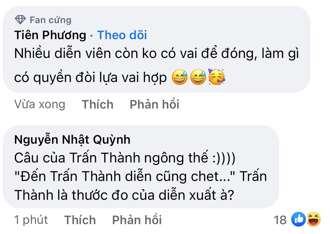 - Ủa, cái câu 'Đến Trấn Thành diễn còn dở' là sao? Từ khi nào mà Trấn Thành trở thành thước đo diễn xuất vậy?