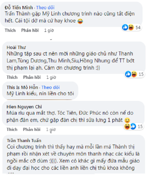 Nhận xét thẳng thắn của Mỹ Linh khiến Trấn Thành 'đứng hình'. Tóc Tiên giải cứu Trấn Thành khi nói: "Tụi em có thể lường trước được hết nhưng tình huống sân khấu nhưng không lường trước được là hôm nay chị tới. Không hề biết cô giáo thanh nhạc tới". Đức Phúc cũng thừa nhận: "Đó là lý do nãy giờ em không dám hát câu nào". Ngô Kiến Huy cũng hài hước pha trò: "Em dẫn chương trình mà còn không dám nói phô mà".