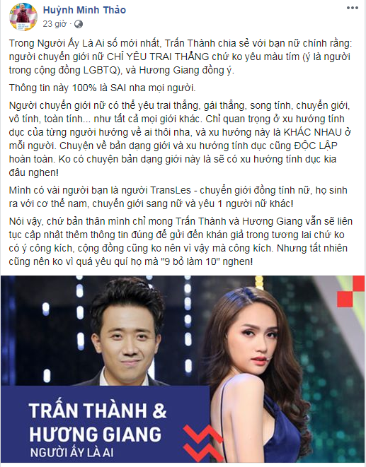 Mới đây nhất, anh Huỳnh Minh Thảo - Chuyên gia làm về thúc đẩy quyền LGBTQ đã có những ý kiến xoay chia sẻ của Hương Giang & Trấn Thành ở tập "Người ấy là ai" vừa qua.