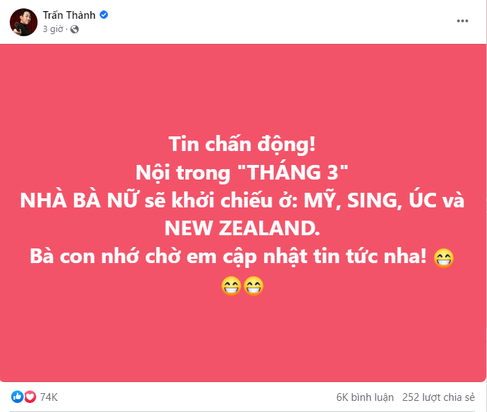 17/02/2023 18:00Trấn Thành xác nhận đem Nhà Bà Nữ 'xuất ngoại' sang Mỹ và nhiều quốc gia khác