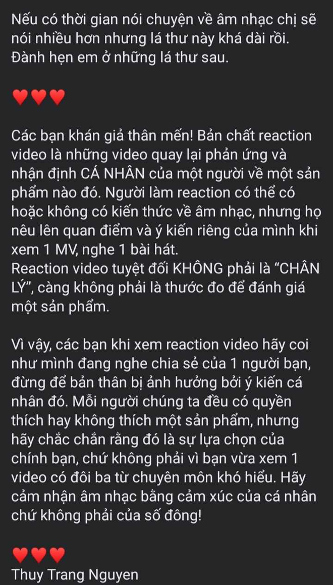 Nữ ca sĩ/nhạc sĩ cho rằng, việc ViruSs chê bai thậm tệ với những lời lẽ nặng nề một ca khúc của người khác cũng giống như làm cha nhưng chê bai con của người khác xấu. “Âm nhạc là vô cùng, và rốt cuộc cũng là những cảm xúc chúng ta gửi gắm, vậy nên khen, chê, thích, ghét cũng nên từ tốn và trân trọng.” Trang Pháp cũng mong khán giả sẽ cởi mở hơn với âm nhạc, phân biệt được video reaction không phải chân lý.