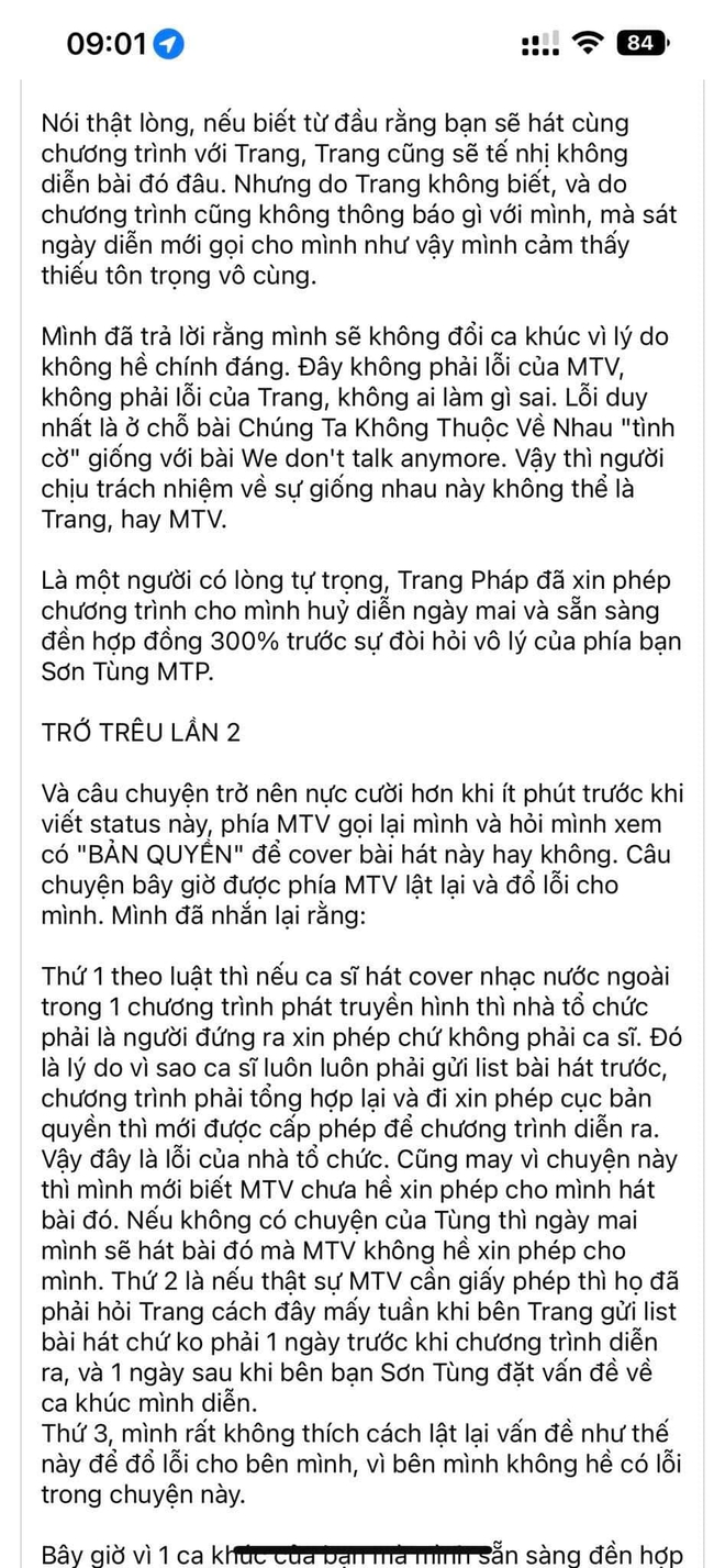 Câu chuyện bị đẩy lên cao trào khi phía chương trình chất vấn Trang Pháp không có bản quyền cover. Trong khi theo quy trình, phía tổ chức là bên xin cấp phép trình diễn. Sát ngày diễn chưa chuẩn bị được list nhạc, lại gặp yêu cầu vô lý, Trang Pháp quyết định huỷ show. Ở thời điểm nổ ra, vụ việc từng gây tranh cãi, Trang Pháp từng bị một bộ phận fan Sơn Tùng “ném đá".
