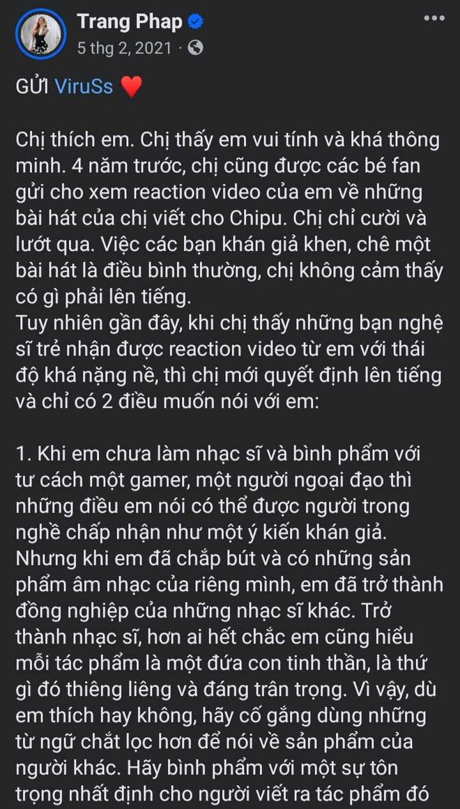 Trở lại tháng 2/2021, Trang Pháp từng trở thành tâm điểm giữa tranh cãi Phí Phương Anh debut làm ca sĩ. Lùm xùm trở nên ồn ào hơn khi ViruSs phê phán sản phẩm không tôn trọng khán giả, thậm chí lên án ekip sản xuất “vô đạo đức". Giữa tâm điểm ồn ào, Trang Pháp đăng đàn tâm thư dài đáp trả những nhận xét tiêu cực của ViruSs.