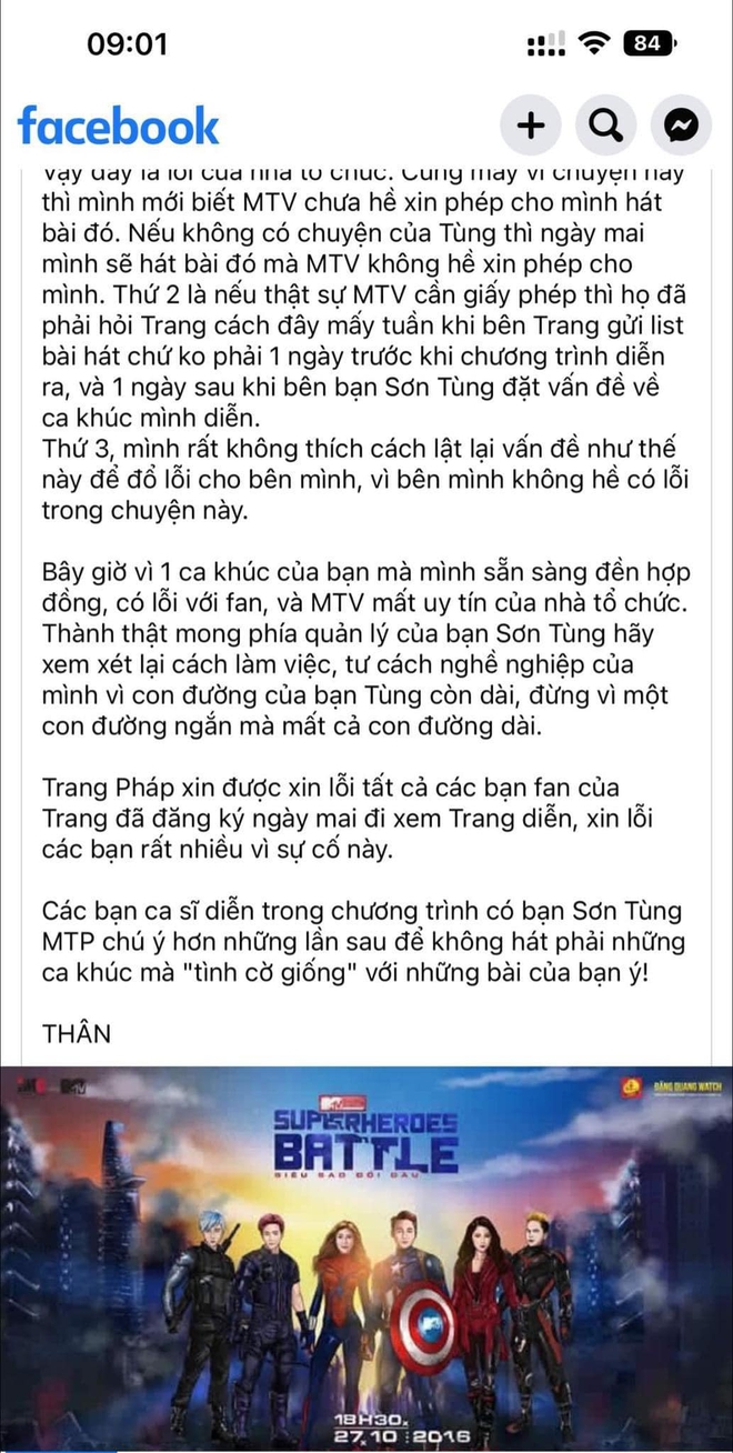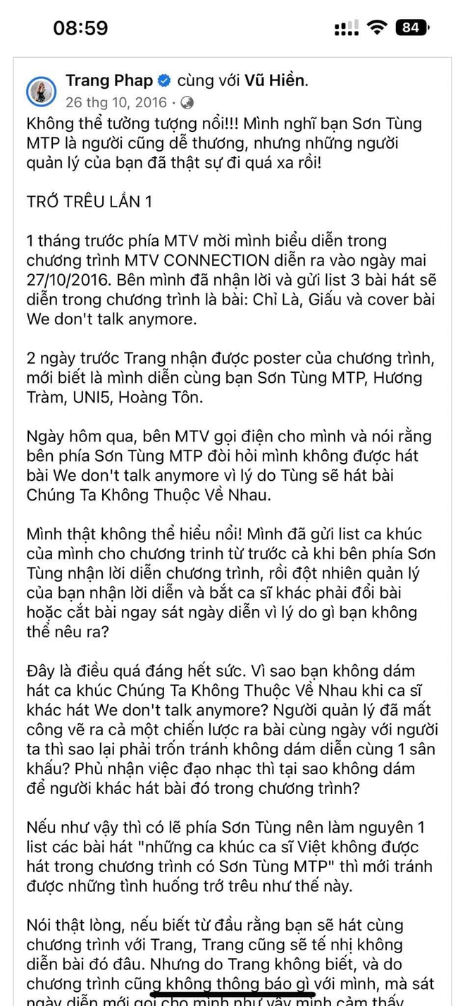 Đầu tiên phải kể đến trạng thái năm 2016, Trang Pháp kể lại lý do khiến cô bất bình đến mức huỷ show. Sự việc liên quan đến Sơn Tùng và ekip khiến netizen cực kỳ chú ý. Theo chia sẻ của Trang Pháp, 8 năm trước, Trang Pháp và Sơn Tùng có duyên xuất hiện trong cùng một show.