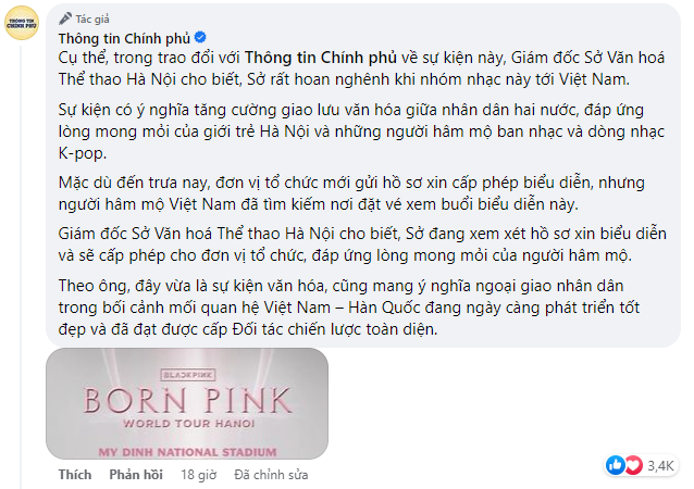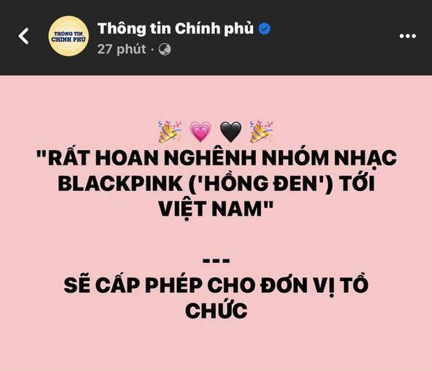 Dưới dòng trạng thái, phía trang Thông tin Chính phủ chia sẻ chi tiết về quyết định trên, đi kèm với tấm poster quảng bá cho 2 đêm diễn của BLACKPINK tại Hà Nội sắp tới.