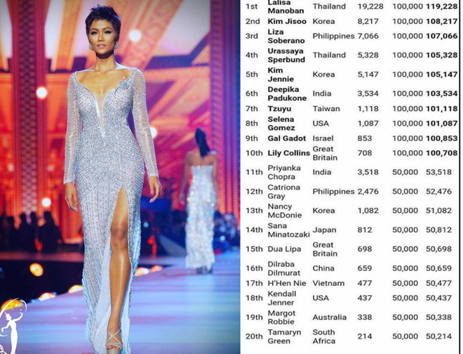 Cụ thể, H'Hen Niê đạt 50.477 điểm, xếp vị trí thứ 17 trong bảng xếp hạng. Trong danh sách Top 10 có sự xuất hiện của nhiều gương mặt nổi tiếng như Lisa, Kim Jisoo, Liza Soberano, Urassaya Sperbund, Kim Jennie, Deepika Padukone, Tzuyu, Selena Gomez, Gal Gadot, Lily Collins. 10 cô gái xuất sắc nhất sẽ bước vào vòng bình chọn cuối cùng với kết quả phụ thuộc hoàn toàn vào công chúng, không có sự can thiệp của chuyên gia.