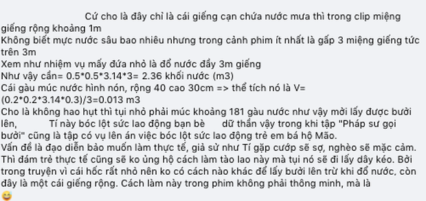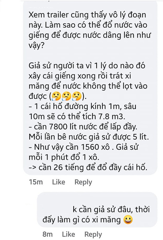 Ngoài ra, khán giả cũng chỉ ra rằng việc đổ nước đầy giếng là không thể. Vì giếng thông với mạch nước ngầm. Đổ đầy giếng nghĩa là dâng mực nước ngầm trong lòng đất lên tầm vài trăm, nghìn mét khối. Bầy trẻ con với mấy cái gáo nước không thể làm được việc này.