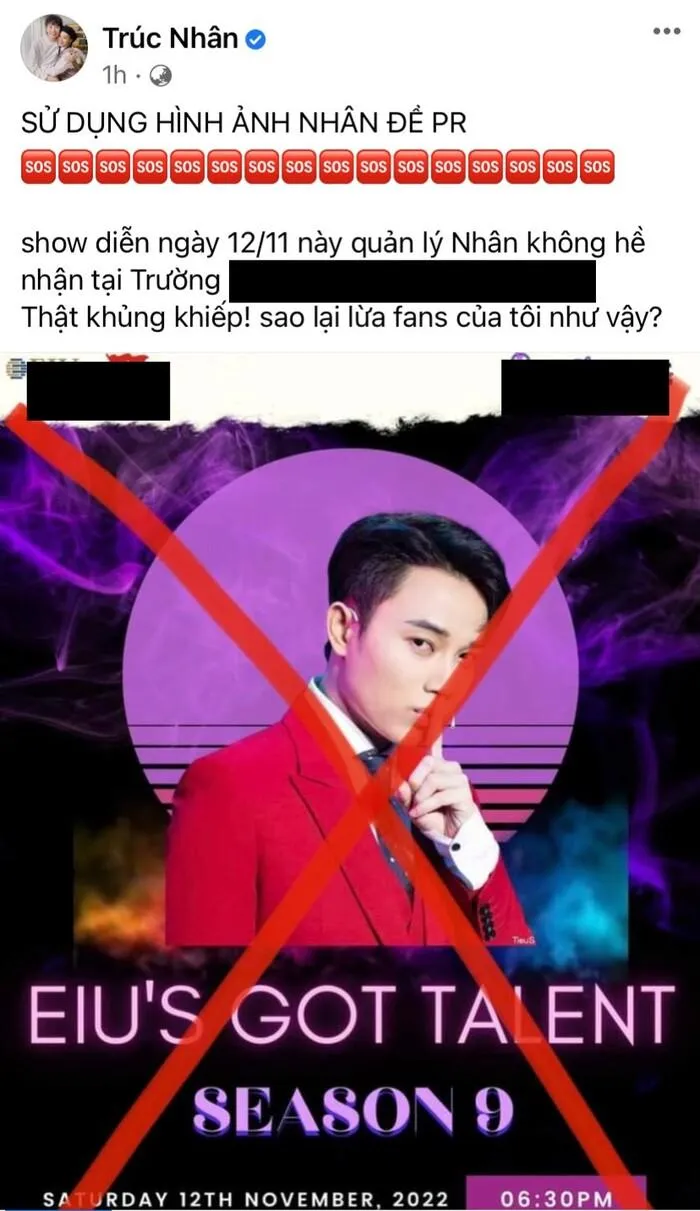 Trúc Nhân bức xúc khi đơn vị tổ chức lợi dụng hình cảnh của anh để lừa dối khán giả. Trúc Nhân viết: "Sử dụng hình ảnh Nhân để PR! Show diễn ngày 12/11 này quản lý Nhân không hề nhận. Thật khủng khiếp! Sao lại lừa fans của tôi như vậy?"