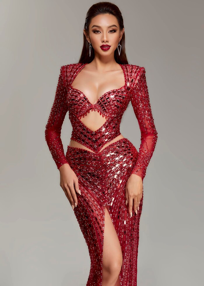 Trong phần mở màn với trang phục dạ hội, đại diện Việt Nam đã mang đến màn trình diễn cực kỳ thu hút với chiếc đầm ộng lẫy được lấy cảm hứng từ kim cương đỏ.