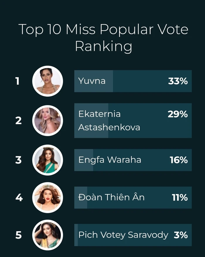 Mặc dù vậy, trong cuộc đua bình chọn giành suất góp mặt trong Top 10, Thiên Ân đang bị các đối thủ mạnh vượt mặt. Hiện tại, đại diện của Mauritius đang dẫn đầu với 33%, theo sau sát nút là Nga với 29%, sau đó là Thái Lan. Thiên Ân đứng vị trí thứ 4 với 11% - một khoảng cách khá xa với đại diện của Mauritius. Netizen cho rằng lần này, các fan khó lòng giúp Thiên Ân đánh bại các đối thủ vào phút chót.