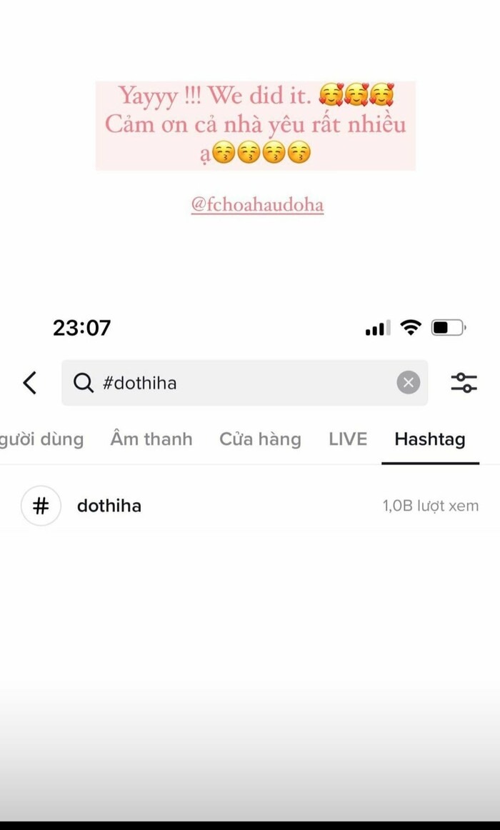 Cụ thể, mới đây Đỗ Thị Hà đã chia sẻ tin vui rằng hashtag #dothiha đã đạt 1 tỷ lượt xem trên ứng dụng Tiktok. Đây là một con số vô cùng lớn bởi kể từ khi đăng quang, Đỗ Thị Hà không tham gia nhiều các hoạt động trong showbiz mà chỉ chủ yếu quay quảng cáo, trình diễn thời trang,... Việc hashtag mang tên nàng hậu đạt 1 tỷ view đã cho thấy được sức hút của cô trong hơn 2 năm qua.