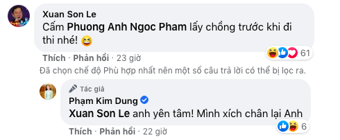Trên mạng xã hội, ông Lê Xuân Sơn - trưởng BTC "Hoa hậu Việt Nam" bình luận vui rằng: "Cấm Phạm Ngọc Phương Anh lấy chồng trước khi đi thi nhé". Ngay lập tức, bà Phạm Kim Dung phản hồi: "Anh yên tâm. Mình xích chân lại anh".