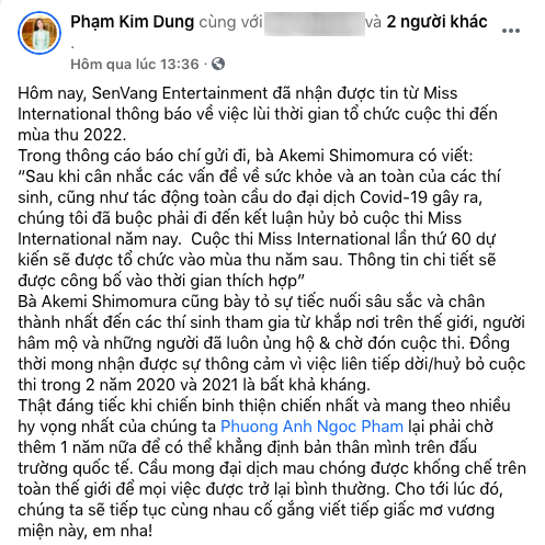 Bà Phạm Kim Dung - phó BTC cuộc thi "Hoa hậu Việt Nam" đồng thời là đại diện đơn vị nắm giữ bản quyền cử người đẹp trong nước đi thi cũng cho biết đã nhận được thông tin "Hoa hậu quốc tế" lùi tổ chức đến mùa thu 2022.
