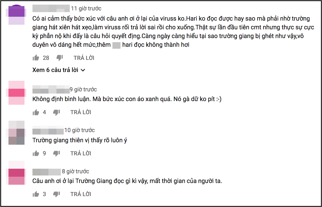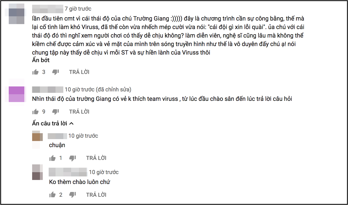 Không riêng Viruss, phần chơi của hai thành viên trong đội anh là Khánh Vy và Osad cũng bị cho nhận về thái độ khó chịu từ Trường Giang. Nhiều khán giả sau khi xem chương trình còn cho rằng, ngay từ màn giới thiệu, nếu như Trường Giang thoải mái trêu đùa với đội S.T, Thuỳ Anh và Phương Lan thì đến đội của Viruss, Osad, Khánh Vy lại hoàn toàn lạnh nhạt.