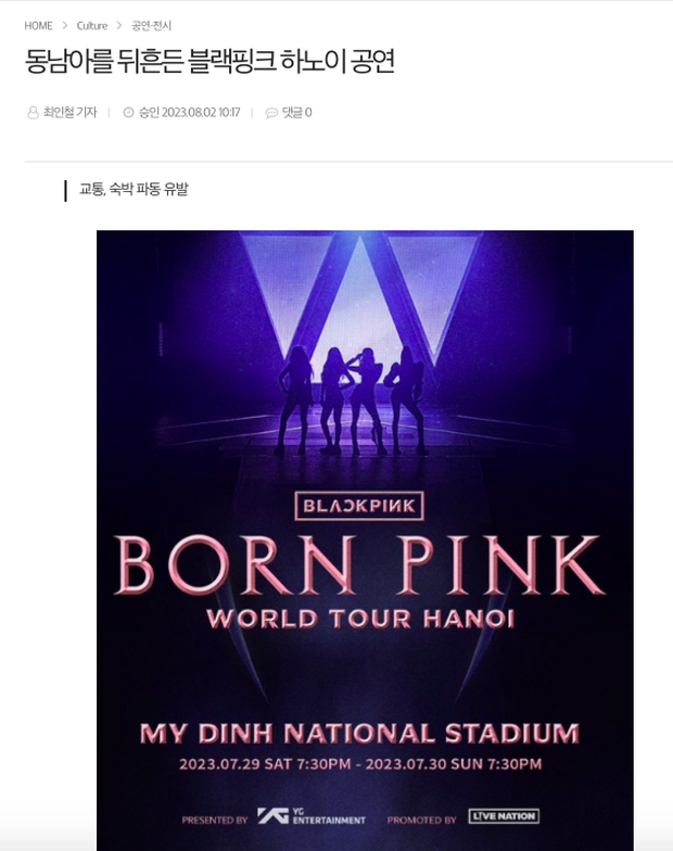Mới đây, tờ Opinion News của Hàn Quốc đã đưa tin với tiêu đề khẳng định: Concert BORN PINK Hà Nội gây chấn động Đông Nam Á. Theo đó, phóng viên Choi In Chul của tờ Opinion News cho biết, sức ảnh hưởng của BLACKPINK đã khiến vé máy bay tới Hà Nội tăng vọt. Mỗi chuyến khứ hồi có giá 9 triệu đồng (khoảng 380 USD). Trong khi đó, giá vé cho buổi biểu diễn cũng lên tới 400 USD (khoảng 9,5 triệu VNĐ).
