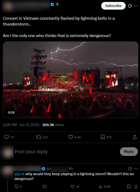 Đáng nói, dù sét đánh ầm trời nhưng concert vẫn diễn ra. Một đoạn video ghi lại cảnh tượng sấm sét liên tục xuất hiện ngay phía trên sân khấu Chông Gai đang lan truyền trên mạng xã hội Twitter (X), thu về hơn 300.000 lượt xem chỉ trong chưa đầy 24 giờ. Đoạn clip ngắn chỉ vài chục giây đã nhanh chóng trở thành tâm điểm bàn luận của cư dân mạng quốc tế. Hình ảnh concert sáng đèn, hiệu ứng ánh sáng ấn tượng kết hợp với những tia sét ngang trời tạo nên hiệu ứng thị giác choáng ngợp, nhưng cũng tiềm ẩn nguy cơ cao.
