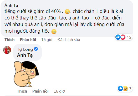 Một khán giả cho rằng "Tiếng cười sẽ giảm đi 40%. Chắc chắn một điều là không ai có thể thay thế cặp 'anh Tào - cô Đẩu', diễn với nhau quá ăn ý, đơn giản mà lại lấy được tiếng cười của mọi người. Đáng tiếc". Đáng chú ý, Tự Long đã thả icon 'Like' tỏ ý đồng tình với nhận xét của vị khán giả này.