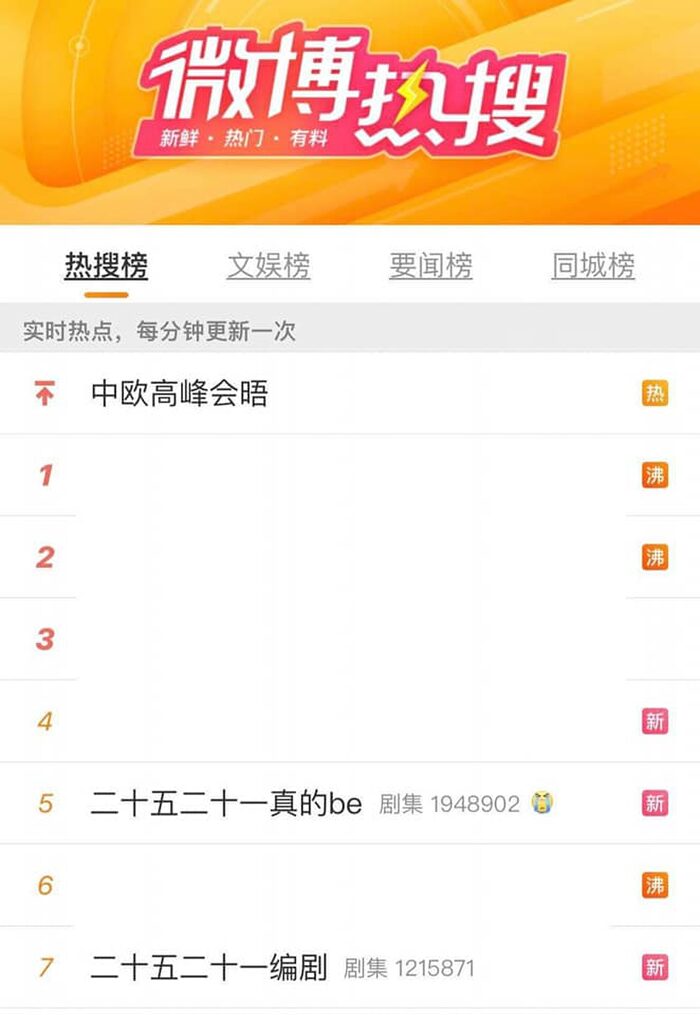 Cái kết buồn của Tuổi 25,Tuổi 21 khiến bộ phim ngay lập tức trở thành chủ đề được bàn tán sôi nổi nhất trên Weibo tối ngày 3/4. Sau khi tập cuối phim lên sóng, top hot search Weibo đều là những từ khóa liên quan đến phim.