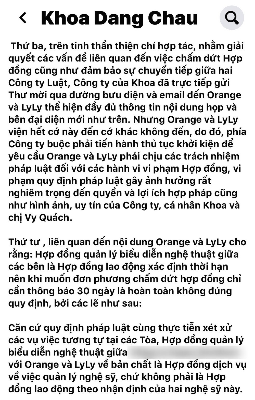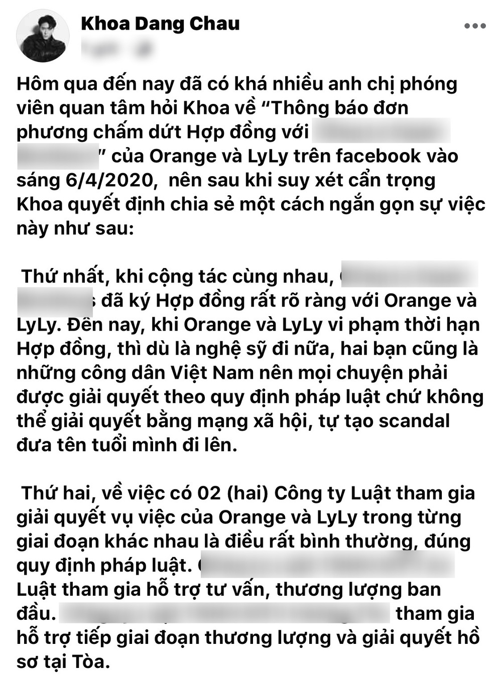 Trong bài đăng của mình, nam nhạc sĩ khẳng định nếu muốn chấm dứt hợp đồng với công ty anh quản lý thì phải thông qua luật sư và toà án, chứ không thể chỉ qua một bài đăng, tự tạo scandal trên mạng xã hội. Từ trước đến nay chưa có tiền lệ nào như thế. Ngoài ra, Châu Đăng Khoa cho rằng việc giải quyết các thủ tục liên quan cần rất nhiều thời gian, chứ không phải muốn thực hiện nhanh chóng là có thể nhanh được như lời Orange nói.