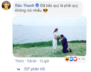 Đáng chú ý nhất, Bảo Thanh cũng vào bình luận 'đúng chất' Thư 'xính lao': 'Đã bảo quỳ là phải quỳ. Không nói nhiều'. Bình luận này của nữ diễn viên nhận được gần 7 ngàn lượt like và hàng trăm phản hồi của khán giả. Đa số tỏ ra thích thú vì cuối cùng Vũ cũng phải quỳ gối xin được cưới Thư đúng như lời 'tiên tri' của cô nàng từ khi cả hai chưa kết hôn lần đầu.