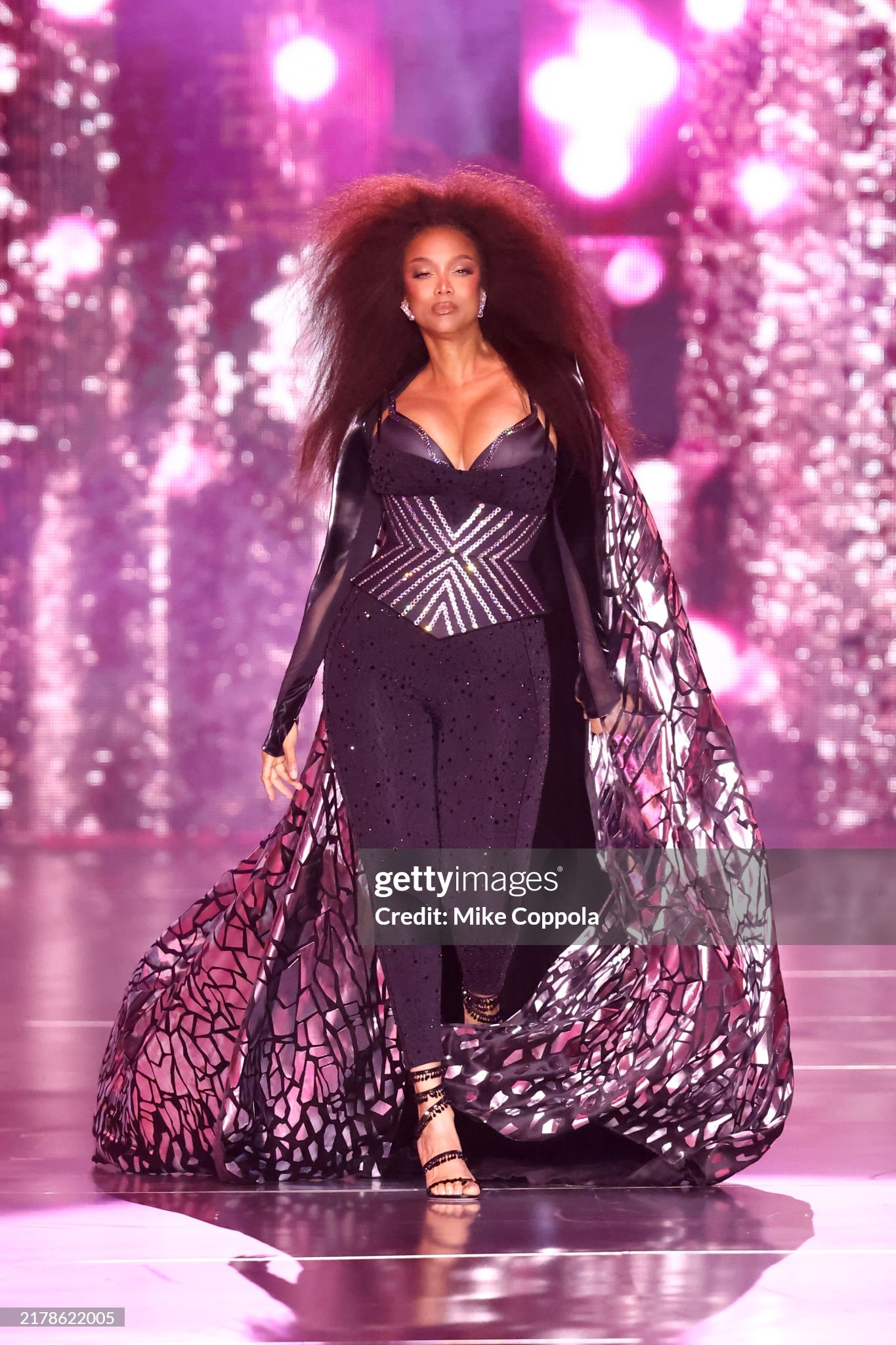 Tyra Banks từng là thiên thần của Victoria's Secret suốt 9 năm bắt đầu từ năm 1997 - 2005. Năm nay siêu mẫu gốc Phi đã được mời trở lại kết show ở VSFS lần này sau 19 năm vắng bóng. Nữ siêu mẫu xuất hiện với mái tóc xù ấn tượng và bộ cánh có phần khá kín đáo.