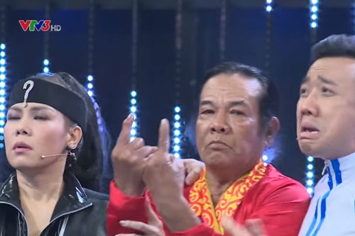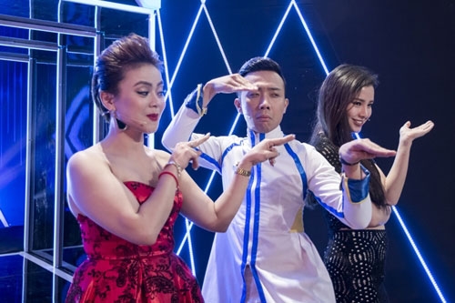 Trong tập 6 cuộc thi "Song đấu", giám khảo Việt Hương đồng hành cùng hai ca sĩ Chi Dân (trái) và Bảo Lan. |