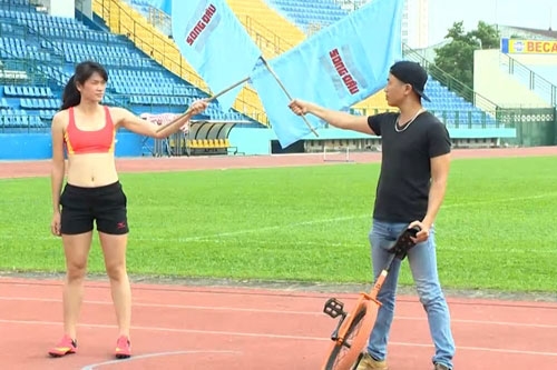 Ở vòng "Ai nhanh hơn", diễn viên xiếc Nguyễn Quang Thế (phải) với kinh nghiệm 18 năm đi xe đạp một bánh đấu cùng vận động viên nhảy vượt rào Lê Thị Thanh Huế, người có 19 năm gắn bó cùng môn thể thao này. Kết quả, chị Thanh Huế đã giành chiến thắng. |