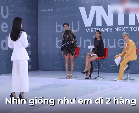 Võ Hoàng Yến tiếp lời: "Cách em xử lý bộ đồ chẳng khác nào em đi hai hàng, giống như em đi cho xong thôi. Mặc dù khuôn mặt của em, chị rất ấn tượng nhưng nhìn cách em đi chị chán quá. Chị không muốn chọn, chị muốn giơ bảng trắng".