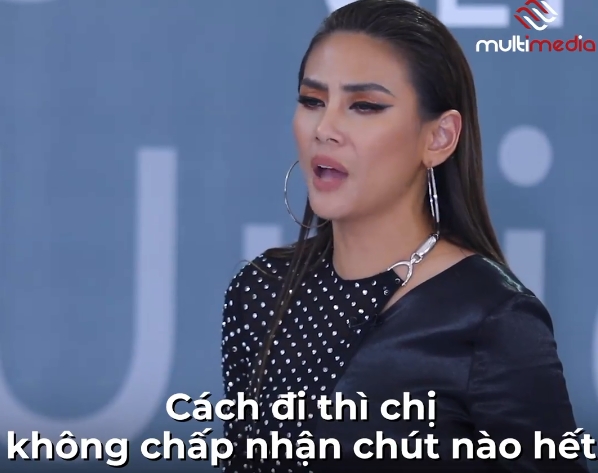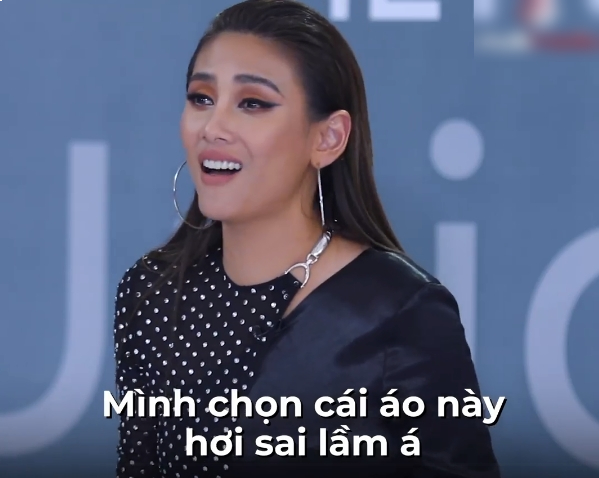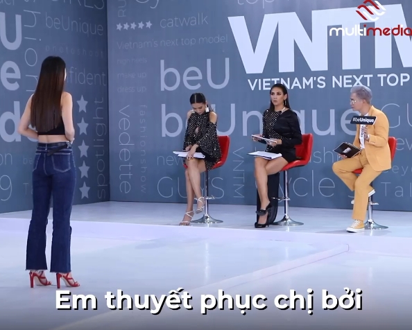 Nam Trung tiếp lời: "Đầu, cổ, vai, tóc, mặt rất là đẹp, trừ cái chỗ bụng đó thôi". Võ Hoàng Yến cắt ngang lời nhận xét: "Thật ra cái chỗ đó không quan trọng lắm đâu. Em mặc bộ đồ này làm tăng khuyết điểm của em là đùi to, hông thấp. Mà em đi kiểu đó nữa thì nó nặng nề".
