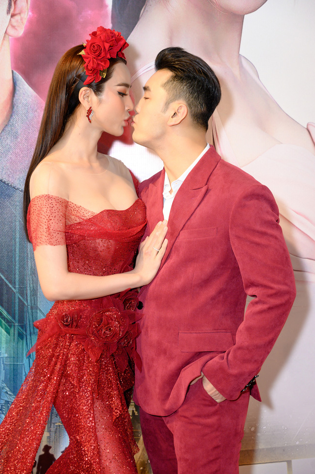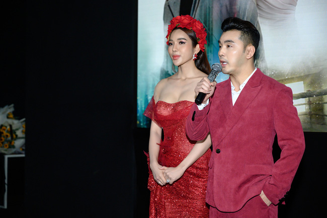 Không chỉ "yêu lại từ đầu" trong Web Drama Chàng phi công của em, vợ chồng Ưng Hoàng Phúc còn tổ chức buổi họp báo theo phong cách như một buổi "lễ tái hôn" của chính mình. Trong khi Ưng Hoàng Phúc diện vest đỏ lịch lãm thì bà xã Kim Cương cũng vô cùng lộng lẫy với chiếc đầm cúp ngực tông xuyệt tông. Đặc biệt, cả hai còn trao nhau nụ hôn ngọt ngào khiến cho các khách mời có mặt đều không khỏi xuýt xoa trước sự lãng mạn của cặp đôi.