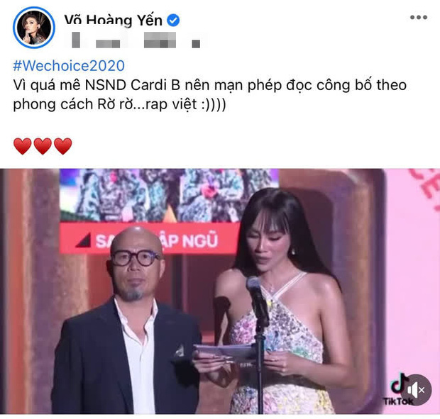 Cách nhấn nhá của Võ Hoàng Yến đã gây chú ý khi cô xướng tên hạng mục TV Show của năm ở WeChoice Awards 2020.