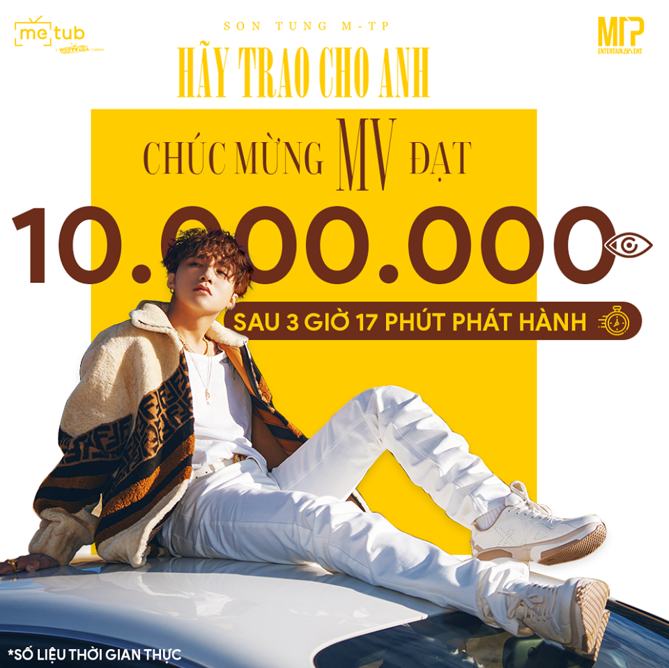 Sau 3 tiếng 17 phút kể từ khi lên sóng, METUB - đối tác chính thức của Youtube ở Việt Nam cho biết MV "Hãy Trao Cho Anh" đã xuất sắc cán mốc 10 triệu view. Đây là lượng view real-time được tính đến thời điểm hiện tại, được cập nhật qua hệ thống Analytics Realtime của Youtube.