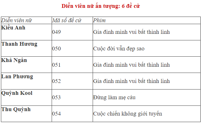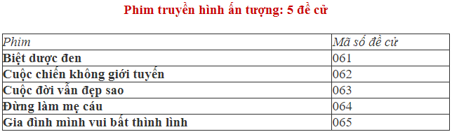 Một trong những hạng mục được nhiều khán giả quan tâm là Phim truyền hình ấn tượng với 5 đề cử dành cho các tác phẩm: Biệt dược đen, Cuộc chiến không giới tuyến, Cuộc đời vẫn đẹp sao, Đừng làm mẹ cáu và Gia đình mình vui bất thình lình.