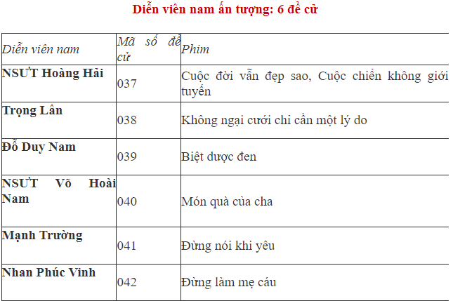 Hai hạng mục Diễn viên nam - nữ ấn tượng quy tụ những gương mặt đầy sức hút của phim truyền hình. Duy Nam gây chú ý khi góp mặt ở hạng mục Diễn viên nam ấn tượng. Với diễn xuất ấn tượng trong vai Đạt "điên" phim Biệt dược đen, nam diễn viên Duy Nam nhận được nhiều sự ủng hộ chiến thắng giải thưởng này.