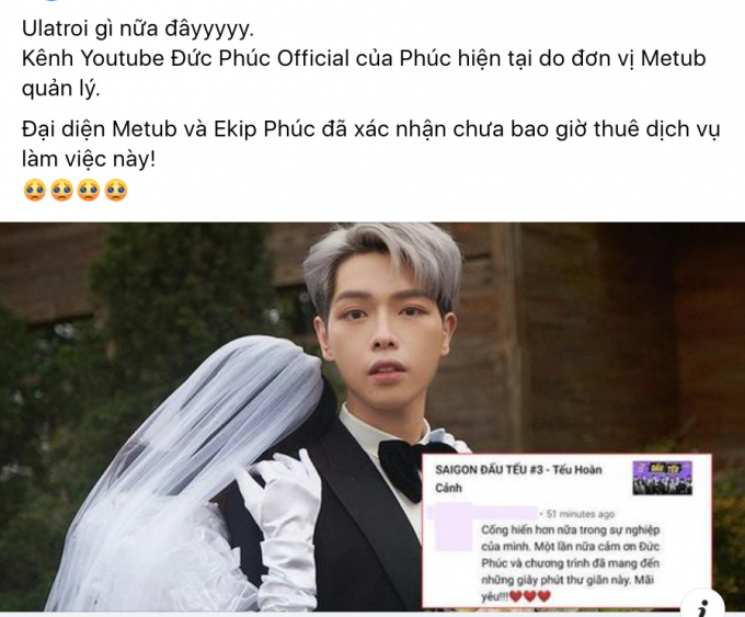 Mới đây, người đại diện truyền thông của Đức Phúc vừa có chia sẻ trên trang cá nhân về việc nam ca sĩ bị "bóc" mua seeding tăng tương tác. Người này tỏ ra khá bất ngờ khi có thông tin thất thiệt như vậy. Người này viết: "Gì nữa đây. Kênh Youtube Đức Phúc Official của Phúc hiện tại do đơn vị Metub quản lý. Đại diện Metub và ê-kíp Phúc đã xác nhận chưa bao giờ thuê dịch vụ làm việc này".