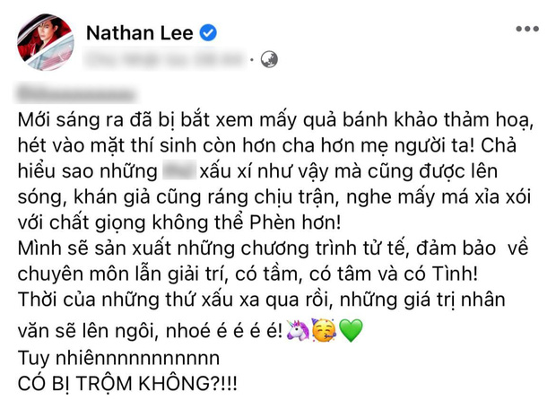 Nathan Lee nổi tiếng là người bộc trực và không ngại "đụng chạm" của showbiz Việt. Trên trang cá nhân hay các buổi livestream, cộng đồng mạng cũng quá quen với những chia sẻ vô cùng thẳng thắn của nam ca sĩ.