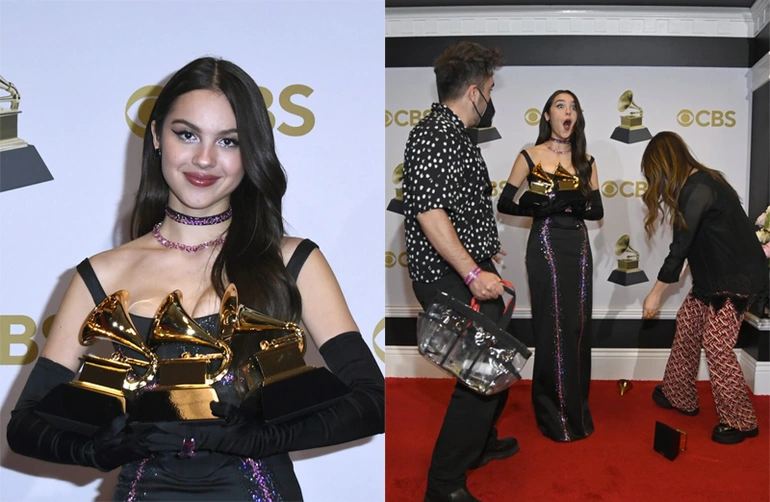 Thắng lớn sau lễ trao giải, Olivia Rodrigo hạnh phúc ẵm trên tay 3 chiếc cúp kèn vàng danh giá vui vẻ chụp hình trong phòng họp báo. Trong khoảnh khắc xúc động, nữ ca sĩ đã đánh rơi một chiếc cúp của mình và chiếc kèn vàng Grammy gãy làm đôi.