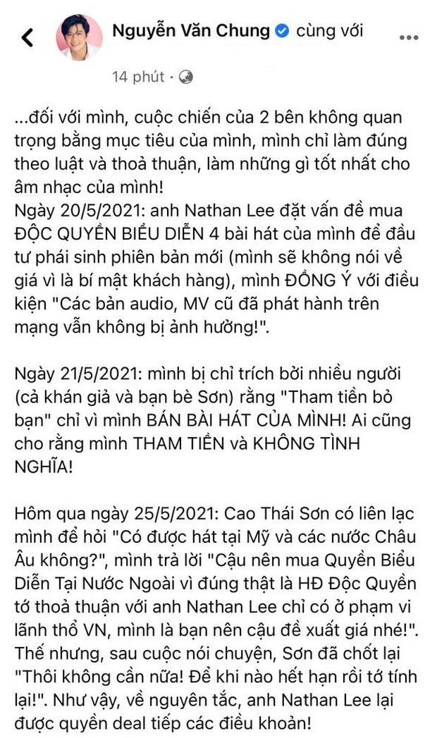 Hôm nay 26/5/2021, anh Nathan Lee đã chốt lại là sẽ mua độc quyền biểu diễn các ca khúc trên vô thời hạn trên mọi lãnh thổ (tất nhiên với chi phí cao hơn), tiền tác quyền sẽ được trả liên tục hằng năm, phân chia lợi nhuận trên Youtube và các nền tảng nhạc số khác, ưu tiên kênh Youtube của Nguyễn Văn Chung, ngoài ra các đơn vị vẫn được sử dụng và được thu tiền như bình thường!