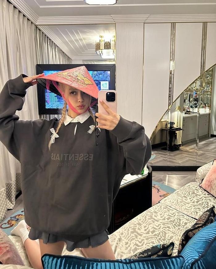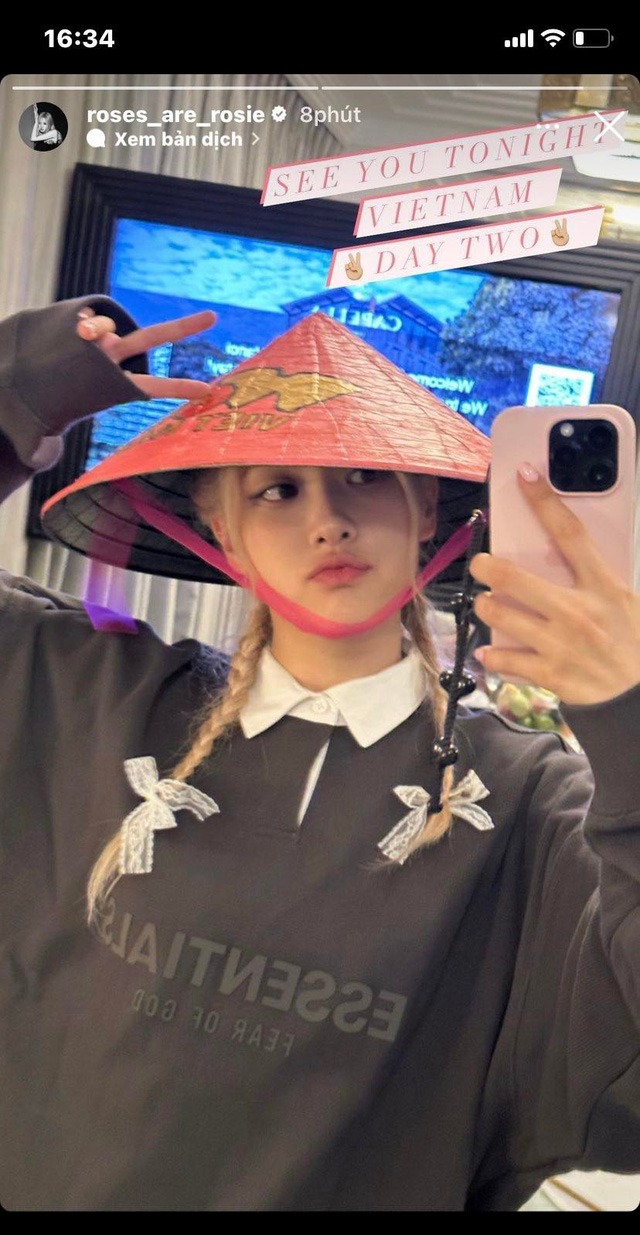 Trước đó, các cô gái nhà YG cũng khiến fan nức lòng khi đăng tải những hình ản đậm chất Việt Nam trên trang cá nhân. Cụ thể vào chiều qua, trước khi diễn ra concert Born Pink đêm thứ 2 tại Mỹ Đình, Rosé cũng đăng tải hình ảnh cô tự chụp với chính chiếc nón lá Việt Nam. Trên nón lá vẫn ghi chữ Việt Nam.