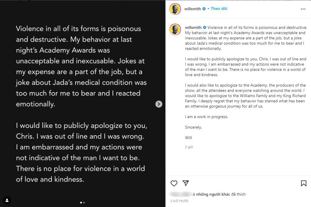 Tôi muốn gửi lời xin lỗi đến gia đình Williams và gia đình King Richard (bộ phim giúp anh mang về giải Oscar diễn xuất - PV) của tôi. Tôi vô cùng hối hận vì hành vi của mình đã làm vấy bẩn những gì từng là một hành trình tuyệt đẹp với tất cả chúng ta. Tôi vẫn còn là một người chưa hoàn hảo...".