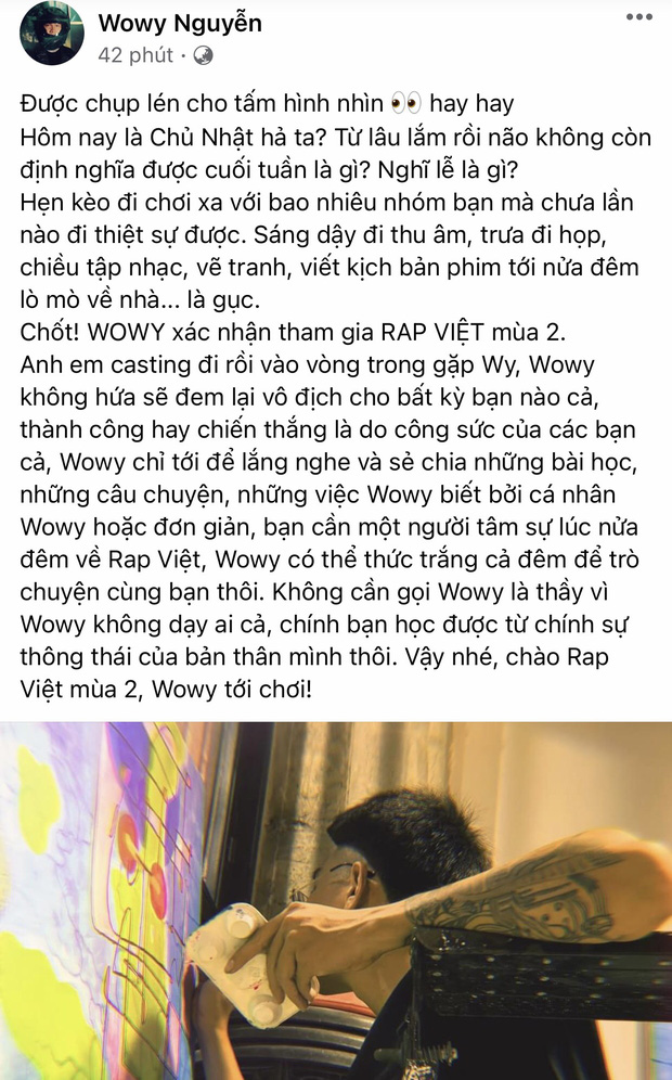 Đêm 11/4, trên fanpage cá nhân của mình, Wowy bất ngờ thông báo anh sẽ trở lại với vị trí huấn luyện viên Rap Việt mùa 2. 'Lão đại làng Rap' kêu gọi mọi người đi casting và gặp gỡ anh tại vòng trong.