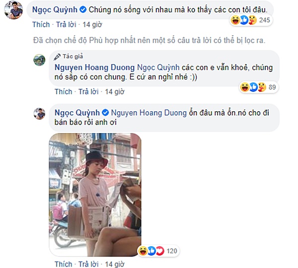 Không chỉ Mạnh Trường, diễn viên Ngọc Quỳnh (vai Thái - chồng Khuê trong Hoa hồng trên ngực trái) cũng thắc mắc: 'Chúng nó sống với nhau mà không thấy các con tôi đâu'. Thành viên ekip lại phim hài hước trả lời lại: 'Các con em vẫn khỏe, chúng nó sắp có con chung. Em cứ an nghỉ nhé'. Ngọc Quỳnh vẫn tiếp tục 'nhây' khi tung bức ảnh bằng chứng bé Bống phải đi bán báo dạo kèm bình luận: 'Ổn đâu mà ổn, nó cho đi bán báo rồi anh ơi'.